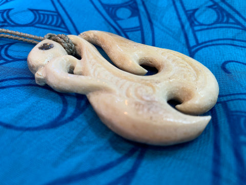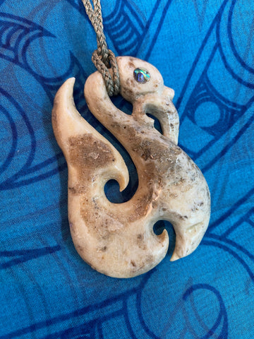 Intricate Manaia/ Hook in whale (Tohorā) bone with Paua Shell. The Manaia represents the head of a bird, body of a man, and the tail of a fish, a beautiful symbol of the connection to our surrounding environment. Provides the wearer health, peace and protection. This pendant is also in the shape of a fish hook symbolising our connection to the sea, bringing prosperity and safety over water.